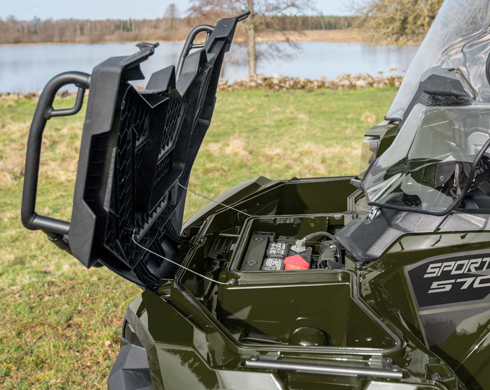 12-volt power plug, in-pod trickle charging port, PIN-activated security system (P.A.S.S.), Front rack extender, winch mount included